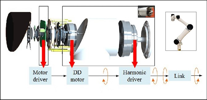 The mechanical arm is defined as a reprogrammable multifunctional manipulator designed to move material, parts, tools, or specialized devices through variable programmed motions for the performance of a variety of tasks. The mechanical structure of the mechanical arm is composed of six links and joints. Links are the main bodies that make the mechanism and are connected to each other by joints. The first three joints are responsible for linear motion in space, and the last three joints are responsible for posture change in space. And every joint is composed of driver, motor, reducer and other links, which is shown in Fig.2.